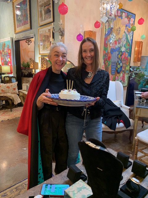 I DID take one photograph! It was Silvia Pavanello’s birthday, and we surprised her with a cake and champagne. Silvia’s on the left, in one of the fabulous kimonos she makes, and Sherry Sanderson of A Little Room, is on the right, wearing one of Anna Porcu’s museum quality cameos she and her Tuscan craftsmen made into a stunning necklace.